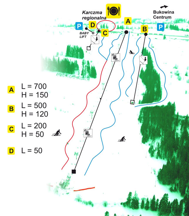 dł. 950m, różnica poziomów 197m, sztucznie naśnieżana, oświetlona |